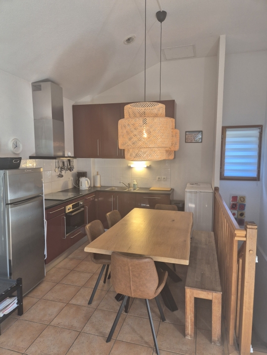 La cuisine du Chalet 96 est moderne et entièrement équipée avec toutes les commodités que vous attendez chez vous. Elle comprend une cuisinière électrique et un four à micro-ondes combiné. De plus, la cuisine est dotée d’un lave-vaisselle, pour que vous n’ayez pas à vous soucier de la vaisselle pendant vos vacances, ainsi que d’un grand réfrigérateur pour stocker tous vos produits frais. Pour ceux qui séjournent plus longtemps, ou pour quiconque souhaite garder les lieux propres et frais, une machine à laver est également disponible.