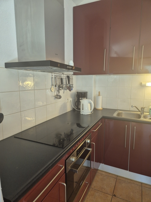 Au premier étage, vous trouverez un salon confortable et une cuisine bien équipée. Le salon est meublé avec un canapé douillet qui peut être converti en lit supplémentaire pour deux personnes si nécessaire. Sous la télévision, il y a un meuble rempli de divers jeux, de Lego et de matériel de bricolage. Dans la grande armoire du coin, vous trouverez une vaste collection de livres à la disposition de nos invités. Pour ceux qui souhaitent rester connectés, nous offrons un accès Wi-Fi gratuit.